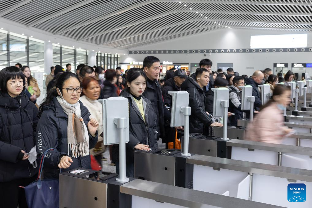 Passengers have their tickets automatically checked before boarding at the Huzhou East Railway Station in Huzhou, east China's Zhejiang Province, Jan. 25, 2025.