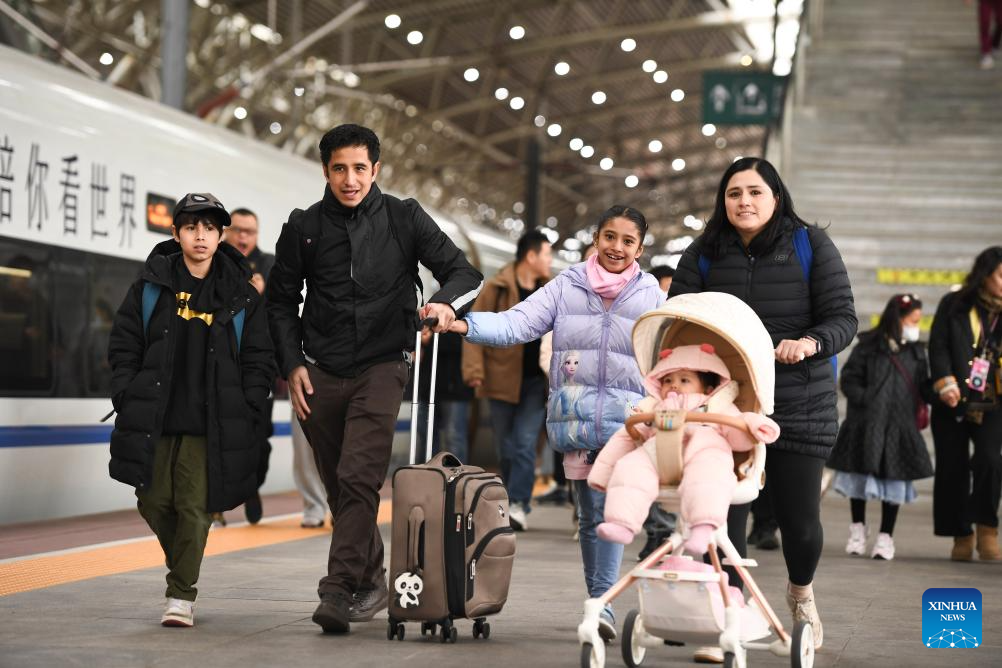 Departing passengers are pictured at a platform of Nanjing Railway Station in Nanjing, east China's Jiangsu Province, Jan. 25, 2025.