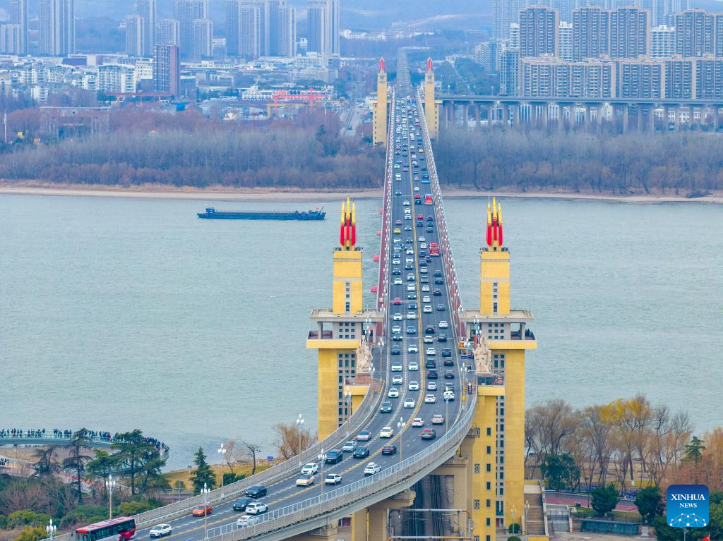 A drone photo shows traffic flows on the Nanjing Yangtze River Bridge in Nanjing, east China's Jiangsu Province, Jan. 25, 2025.