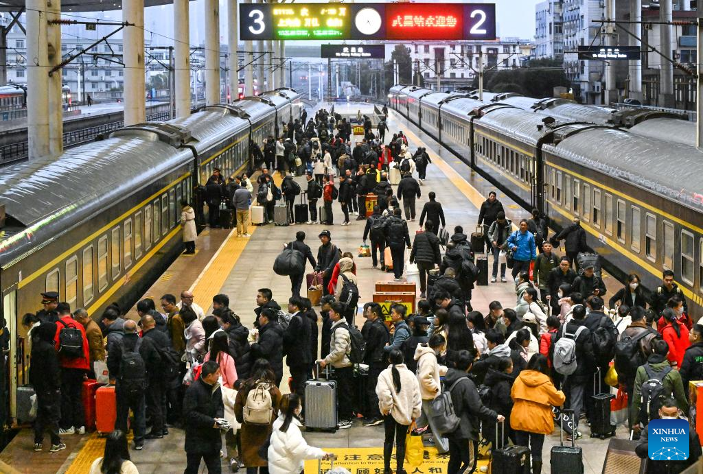Passengers line up to board their trains at the Wuchang Railway Station in Wuhan, central China's Hubei Province, Jan. 25, 2025.