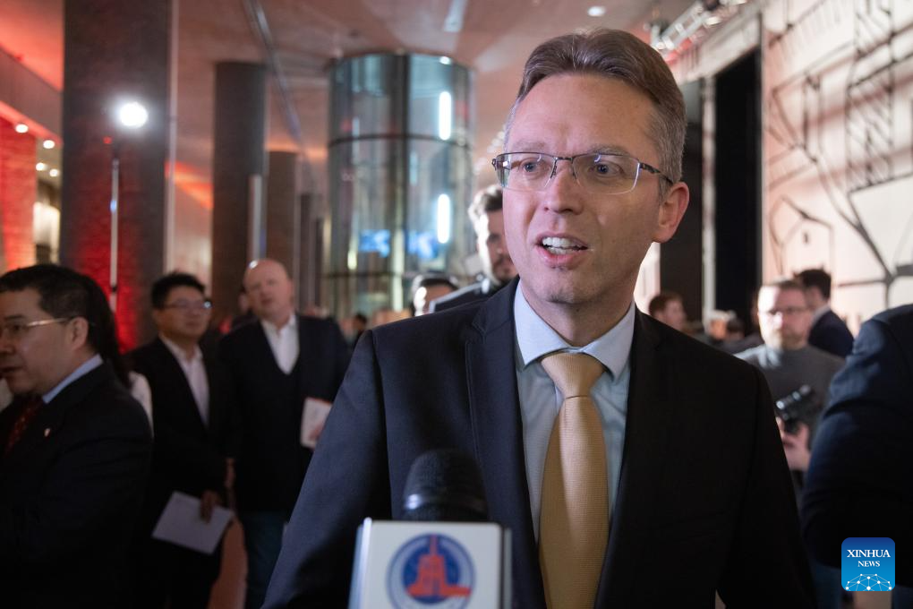 Hungarian Culture and Innovation Minister Balazs Hanko speaks during an interview with Xinhua at the Chinese New Year reception hosted by the Chinese Embassy in Budapest, Hungary, on Jan. 24, 2025. The evening featured captivating performances by the Zhejiang Conservatory of Music's Jiangnan Sizhu Orchestra, which played traditional Chinese pieces such as "The Dance of the Golden Snake" and "The Melody of Plum Blossoms." These performances embodied the Spring Festival's spirit of renewal and hope. (Photo by Attila Volgyi/Xinhua)