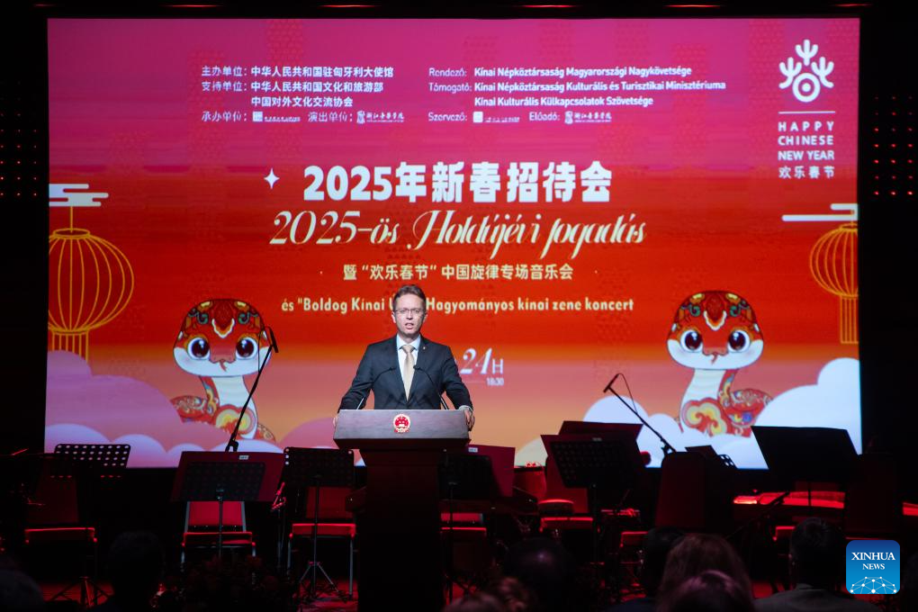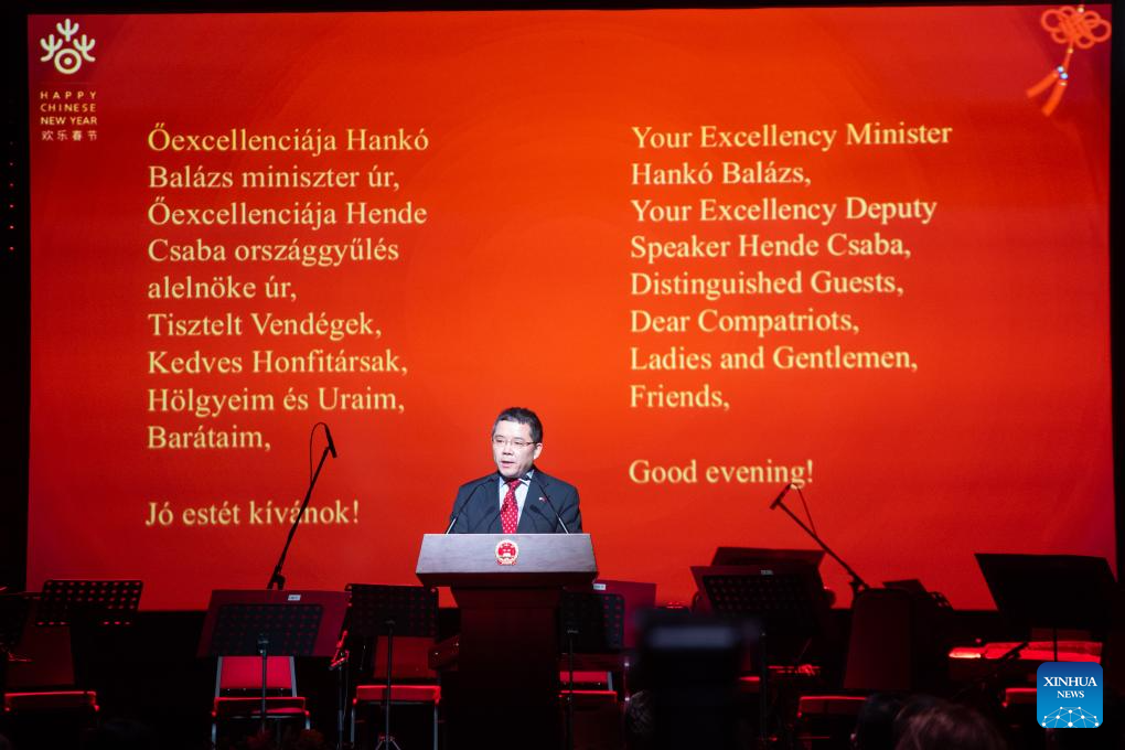 Chinese ambassador to Hungary Gong Tao speaks at the Chinese New Year reception hosted by the Chinese Embassy in Budapest, Hungary, on Jan. 24, 2025. The evening featured captivating performances by the Zhejiang Conservatory of Music's Jiangnan Sizhu Orchestra, which played traditional Chinese pieces such as "The Dance of the Golden Snake" and "The Melody of Plum Blossoms." These performances embodied the Spring Festival's spirit of renewal and hope. (Photo by Attila Volgyi/Xinhua)