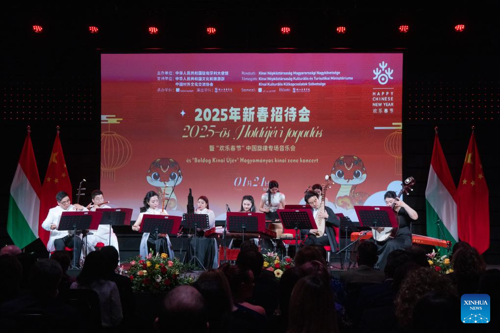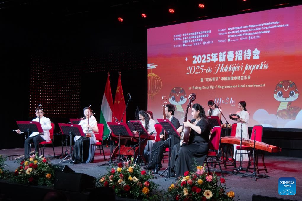 Artists perform at the Chinese New Year reception hosted by the Chinese Embassy in Budapest, Hungary, on Jan. 24, 2025. The evening featured captivating performances by the Zhejiang Conservatory of Music's Jiangnan Sizhu Orchestra, which played traditional Chinese pieces such as "The Dance of the Golden Snake" and "The Melody of Plum Blossoms." These performances embodied the Spring Festival's spirit of renewal and hope. (Photo by Attila Volgyi/Xinhua)