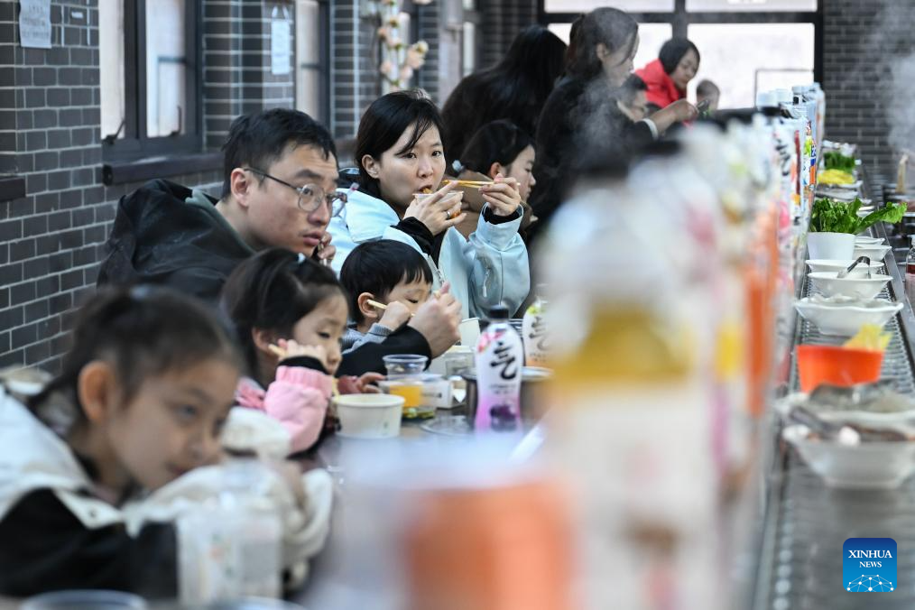 Tourists dine at a restaurant at a ski resort in Shennongjia Forestry District, central China's Hubei Province, Jan. 23, 2025. In recent years, with rich ski resorts and ecotourism resources, Shennongjia Forestry District has witnessed a large number of tourists in winter. The booming tourism has also advanced the development of local "ice and snow economy." (Xinhua/Du Zixuan)