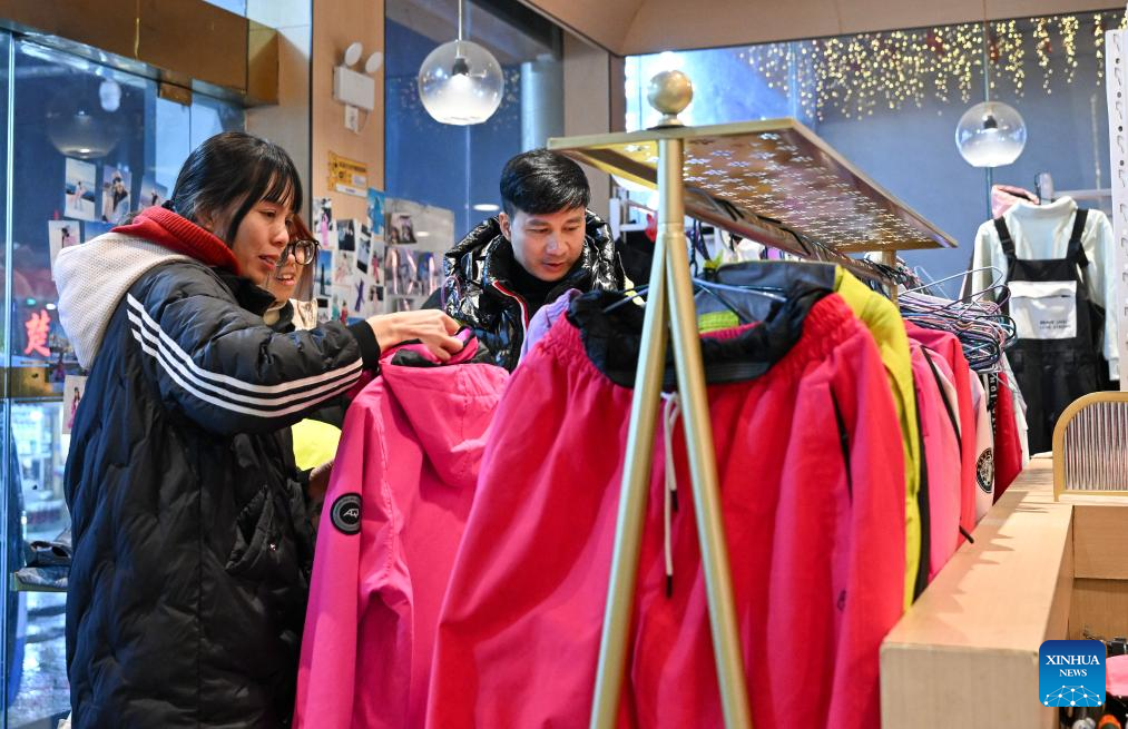 Tourists buy ski equipment at a shop in Shennongjia Forestry District, central China's Hubei Province, Jan. 23, 2025. In recent years, with rich ski resorts and ecotourism resources, Shennongjia Forestry District has witnessed a large number of tourists in winter. The booming tourism has also advanced the development of local "ice and snow economy." (Xinhua/Du Zixuan)