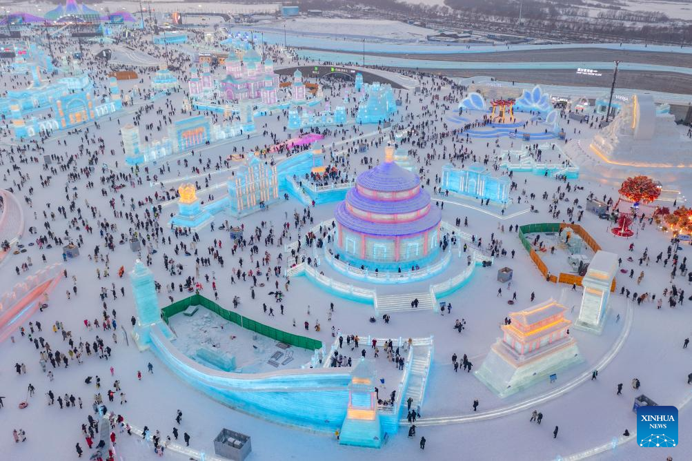 An aerial drone photo show tourists having fun at the Harbin Ice-Snow World in Harbin, capital of northeast China's Heilongjiang Province, Jan. 23, 2025. Harbin has emerged as one of the country's top winter travel destinations, attracting visitors from around the globe. As the city's iconic landmark, the Harbin Ice-Snow World, with this year's edition, the largest in its history, boasts 1 million square meters. (Xinhua/Zhang Tao)