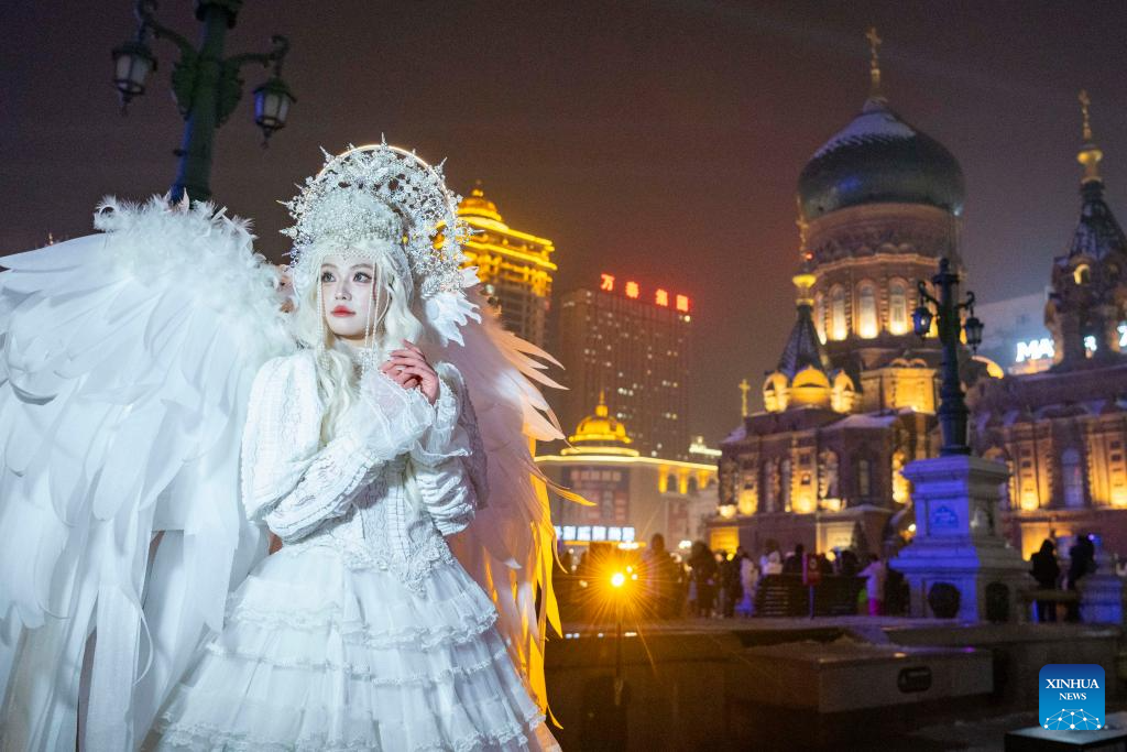Tourists in costumes pose for photos near the St. Sophia Cathedral in Harbin, capital of northeast China's Heilongjiang Province, Jan. 23, 2025. Harbin's centerpiece tourist attraction St. Sophia Cathedral, a centuries-old Byzantine-style building, provides an ideal setting for ladies wearing seemingly opulent attire for a marvel moment in their excursions. (Xinhua/Xie Jianfei)