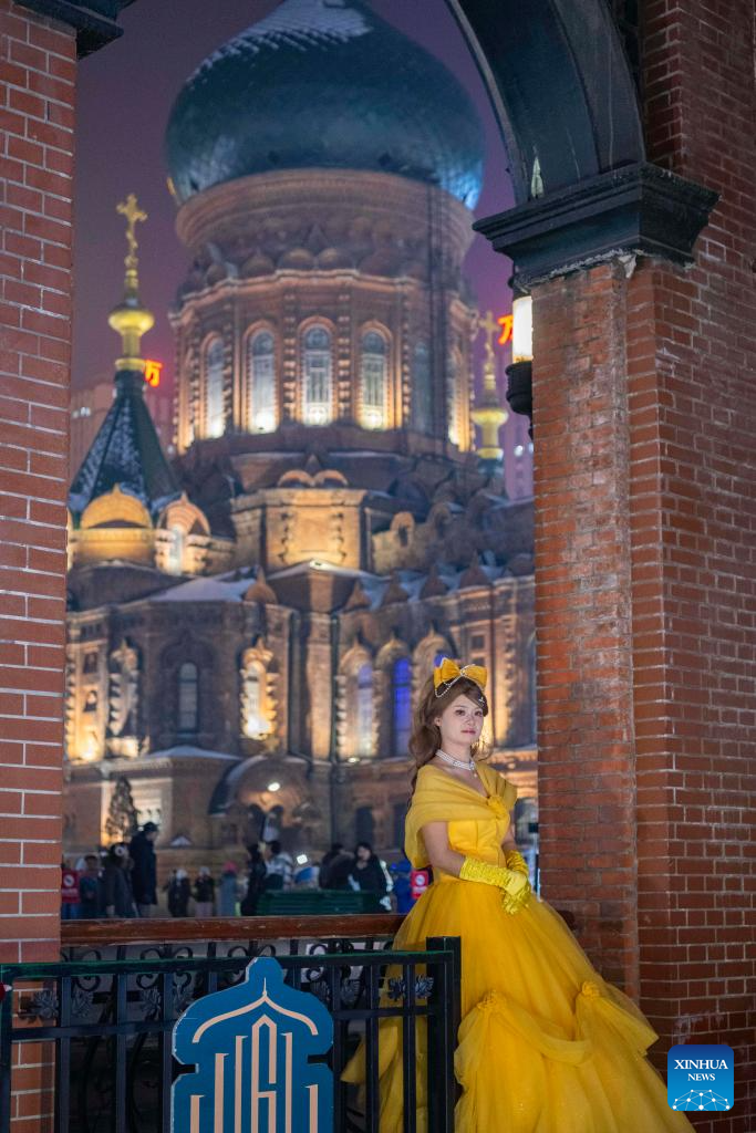 A tourist in costume poses for photos near the St. Sophia Cathedral in Harbin, capital of northeast China's Heilongjiang Province, Jan. 23, 2025. Harbin's centerpiece tourist attraction St. Sophia Cathedral, a centuries-old Byzantine-style building, provides an ideal setting for ladies wearing seemingly opulent attire for a marvel moment in their excursions. (Xinhua/Xie Jianfei)