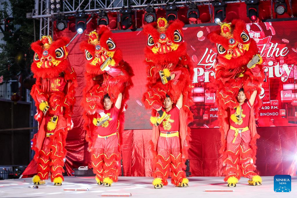 Lion dancers perform during the ceremonial lighting of the prosperity tree to celebrate the upcoming Chinese Lunar New Year in Manila, the Philippines, on Jan. 24, 2025. (Photo by Rouelle Umali/Xinhua)