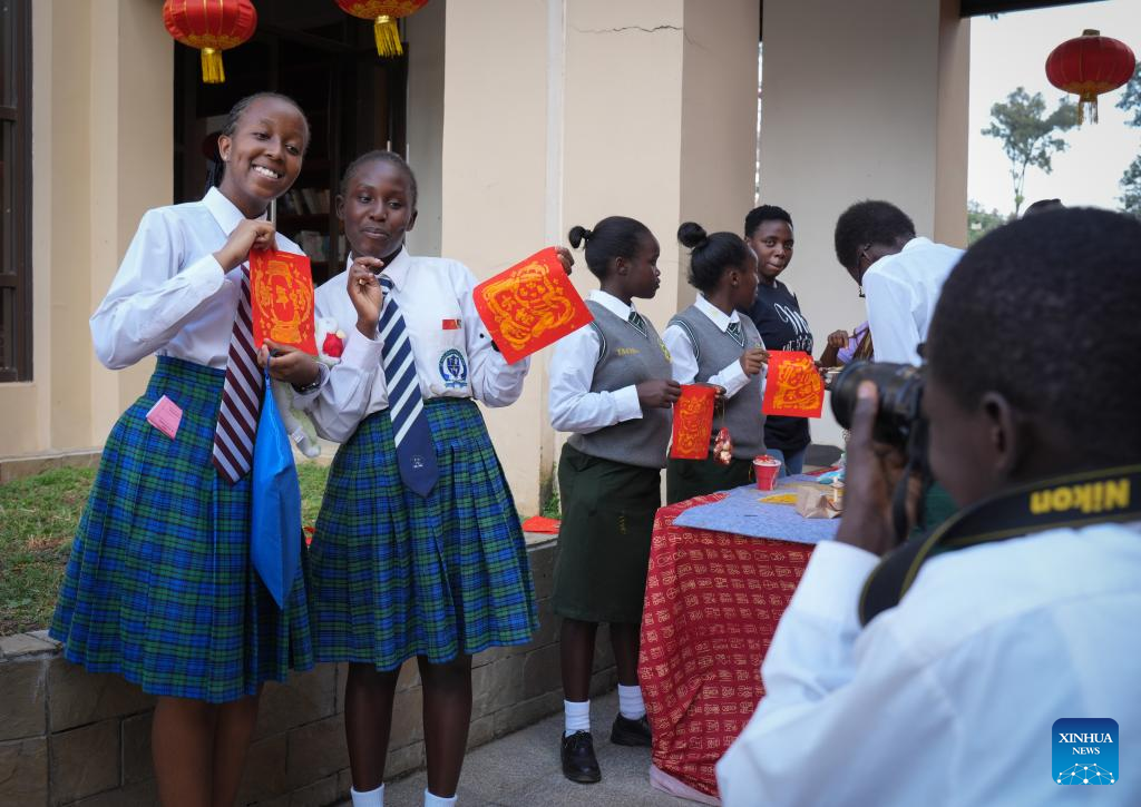 Girls pose for photos with artworks they made during an event to celebrate the upcoming Chinese New Year, or the Spring Festival, in Nairobi, Kenya on Jan. 24, 2025. (Xinhua/Li Yahui)