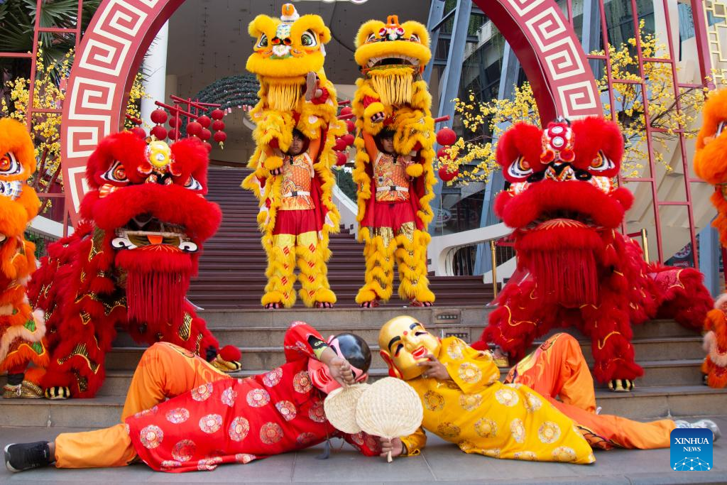 Folk artists perform lion dance in celebration of the upcoming Chinese Lunar New Year, or the Spring Festival, in Siem Reap province, Cambodia, on Jan. 24, 2025. (Photo by Sao Khuth/Xinhua)