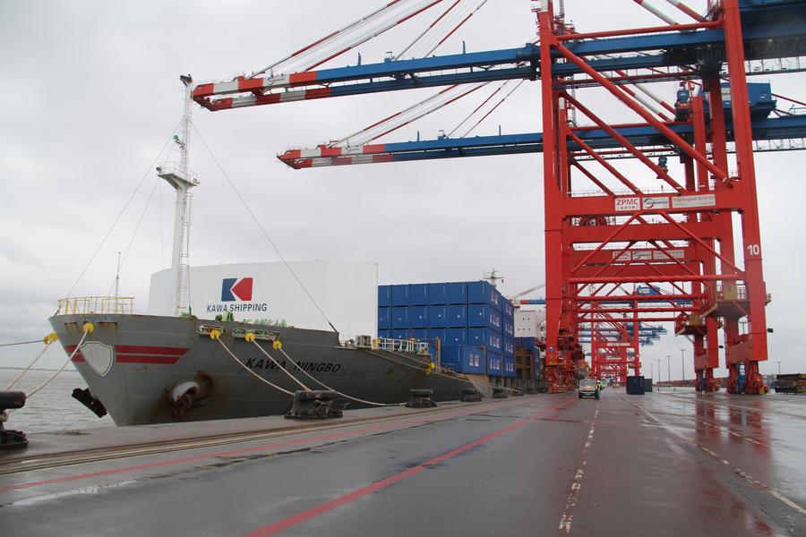 Photo taken on Jan. 24, 2025 shows the "KAWA Ningbo" cargo ship of the "China-Europe Express" in Wilhelmshaven, Germany. The first container ship of the "China-Europe Express", the fastest direct route connecting Europe and China's Yangtze River Delta region, arrived at its destination at the Jade Weser Port in Wilhelmshaven on Friday. (Xinhua/Shan Weiyi)
