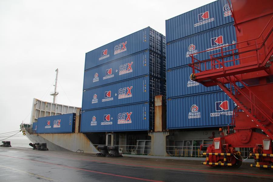 Photo taken on Jan. 24, 2025 shows containers on the "KAWA Ningbo" cargo ship of the "China-Europe Express" in Wilhelmshaven, Germany. The first container ship of the "China-Europe Express", the fastest direct route connecting Europe and China's Yangtze River Delta region, arrived at its destination at the Jade Weser Port in Wilhelmshaven on Friday. (Xinhua/Shan Weiyi)