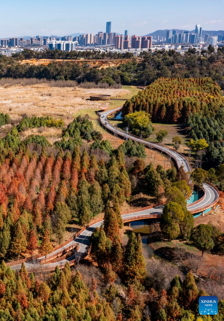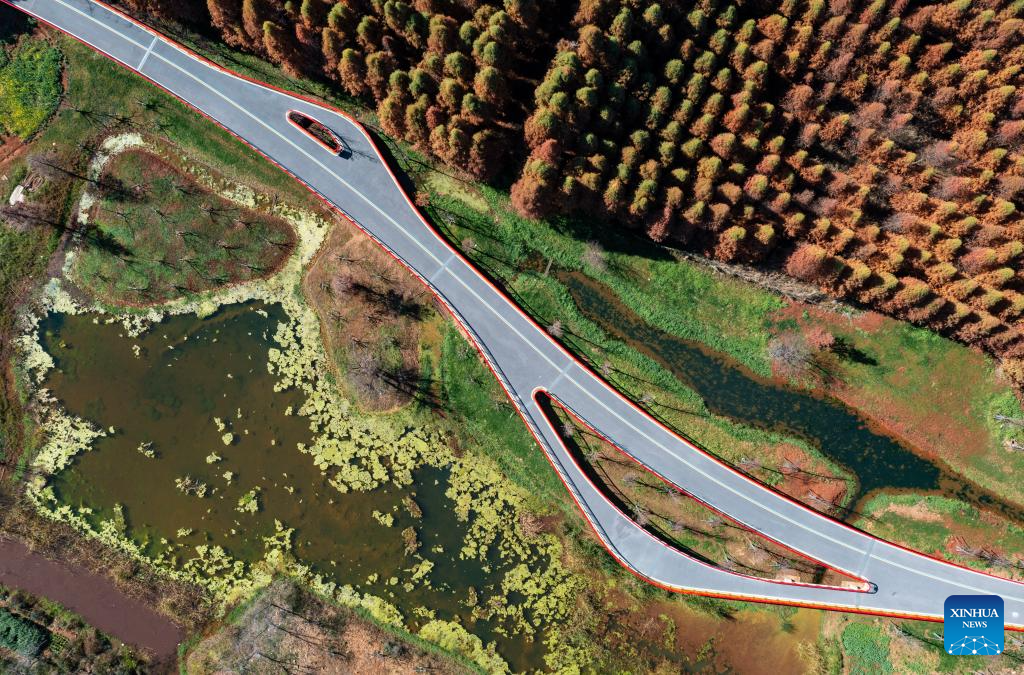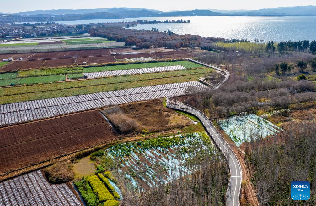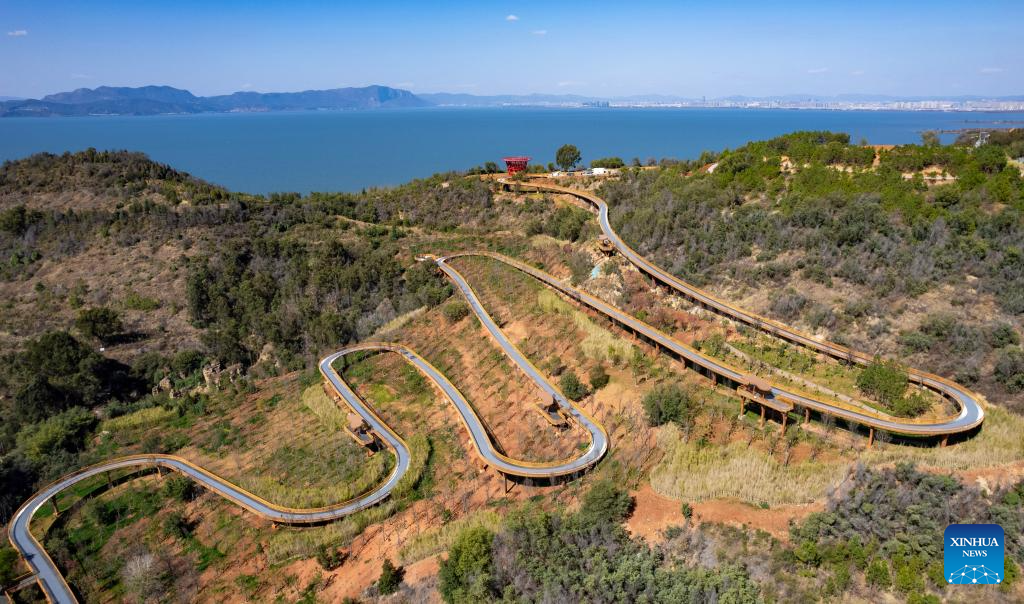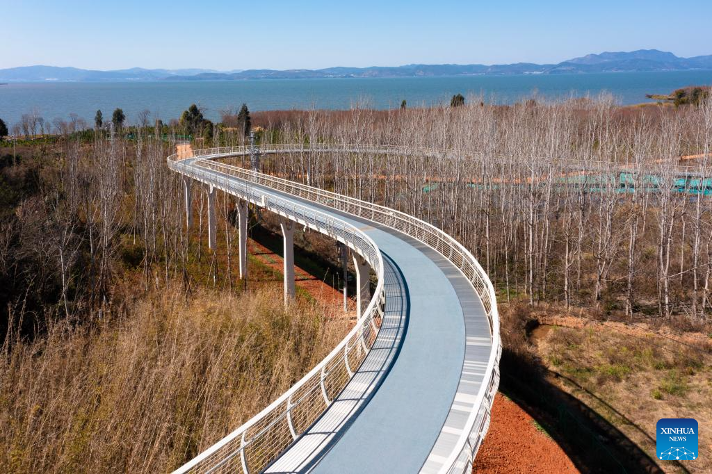 The first-phase project of outer lake section of the Dianchi greenway will officially open to the public during the upcoming Chinese Lunar New Year, or the Spring Festival. The 71.9-kilometer walkway will connect eight wetland parks and more than 20 villages around Dianchi Lake. (Xinhua/Chen Xinbo)