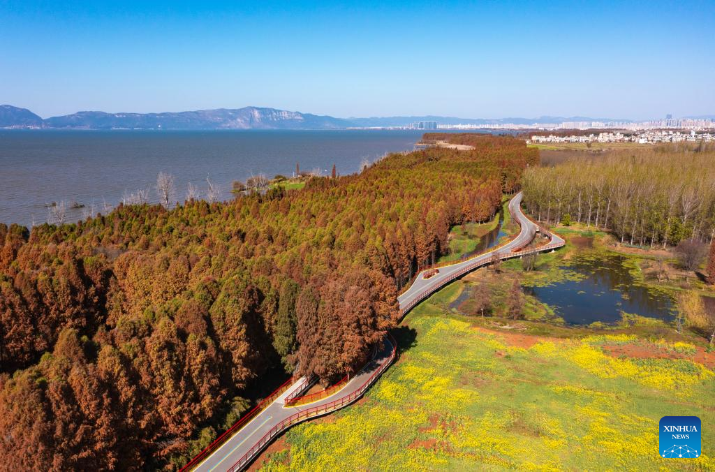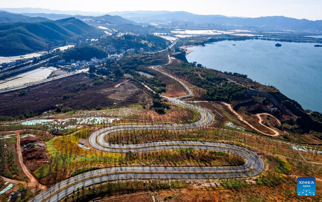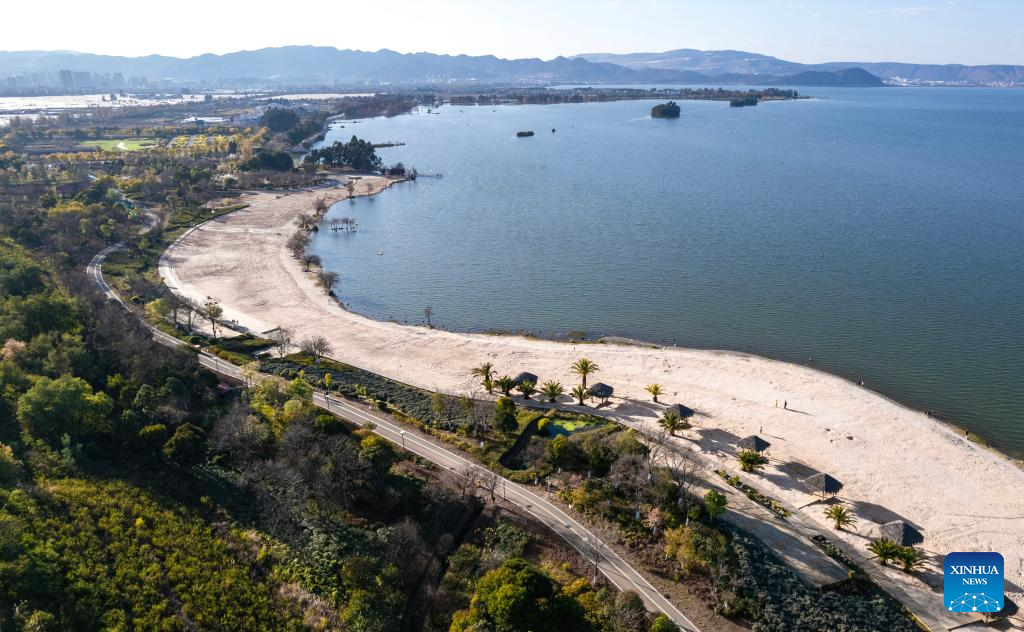 An aerial drone photo taken on Jan. 25, 2025 shows a section of the Dianchi greenway in Kunming, southwest China's Yunnan Province.