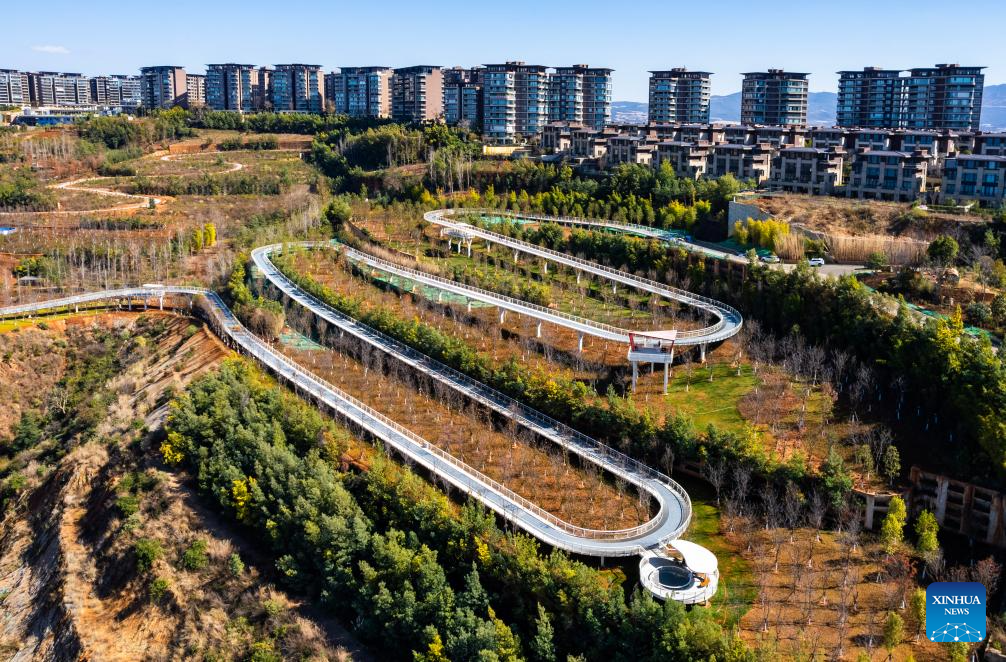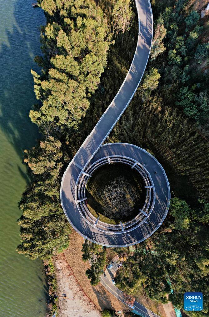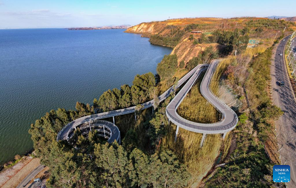 An aerial drone photo taken on Jan. 25, 2025 shows a skywalk section of the Dianchi greenway in Kunming, southwest China's Yunnan Province.