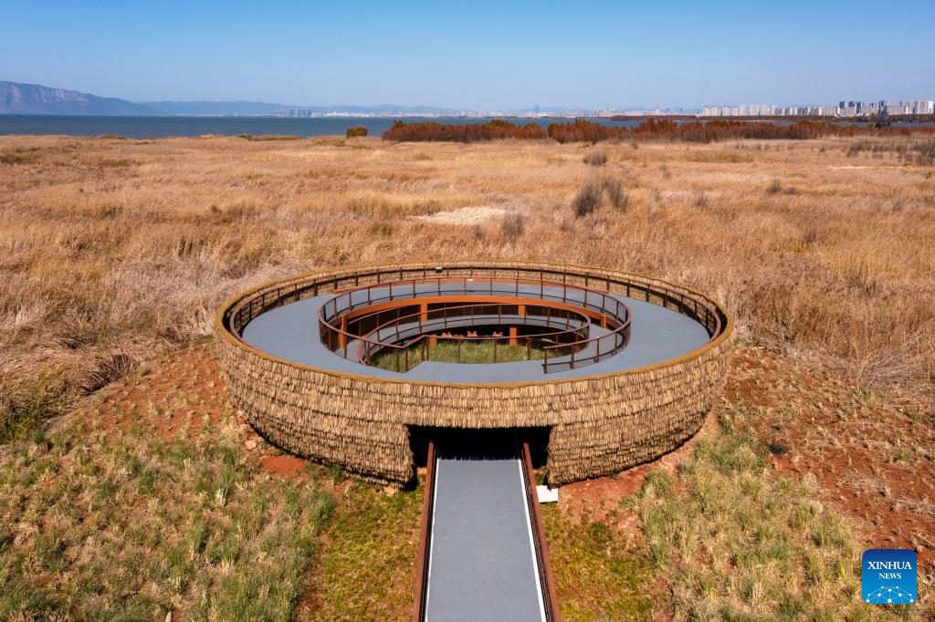 An aerial drone photo taken on Jan. 25, 2025 shows a platform for birdwatching along the Dianchi greenway in Kunming, southwest China's Yunnan Province.