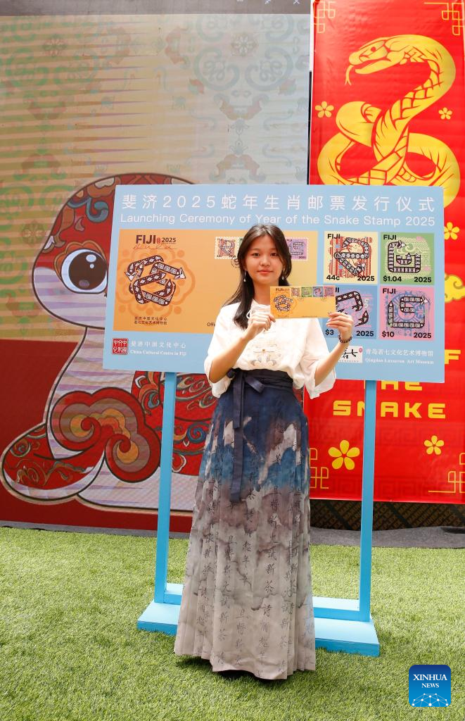 A girl presents a first-day cover with the stamps of the Year of the Snake in Nausori, Fiji, Jan. 25, 2025. Post Fiji and the China Cultural Center in Fiji on Saturday jointly issued special stamps to mark the upcoming Chinese zodiac Year of the Snake. (Photo by Gao Xin/Xinhua)