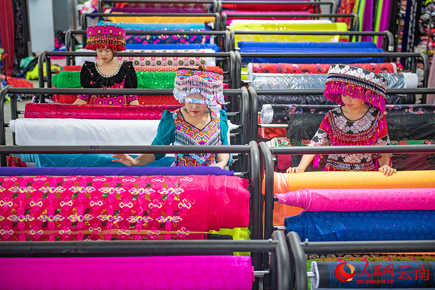 Workers work at the production workshop of Wenshan Yufurong Ethnic Embroidery Co., Ltd. in Wenshan Zhuang and Miao Autonomous Prefecture, southwest China's Yunnan Province. (Photo/Xiong Pingxiang)