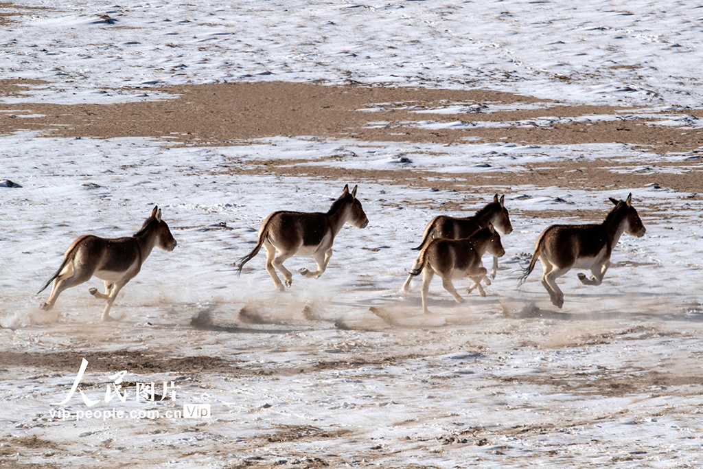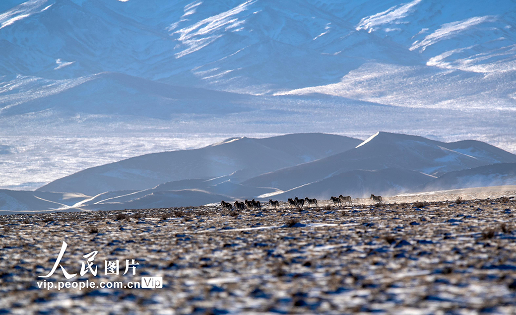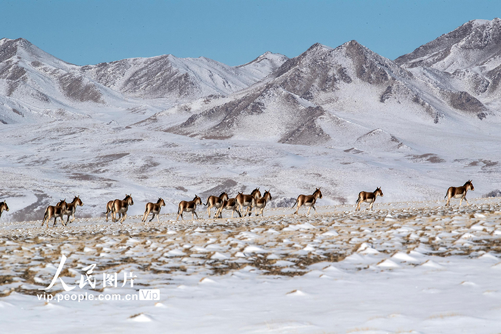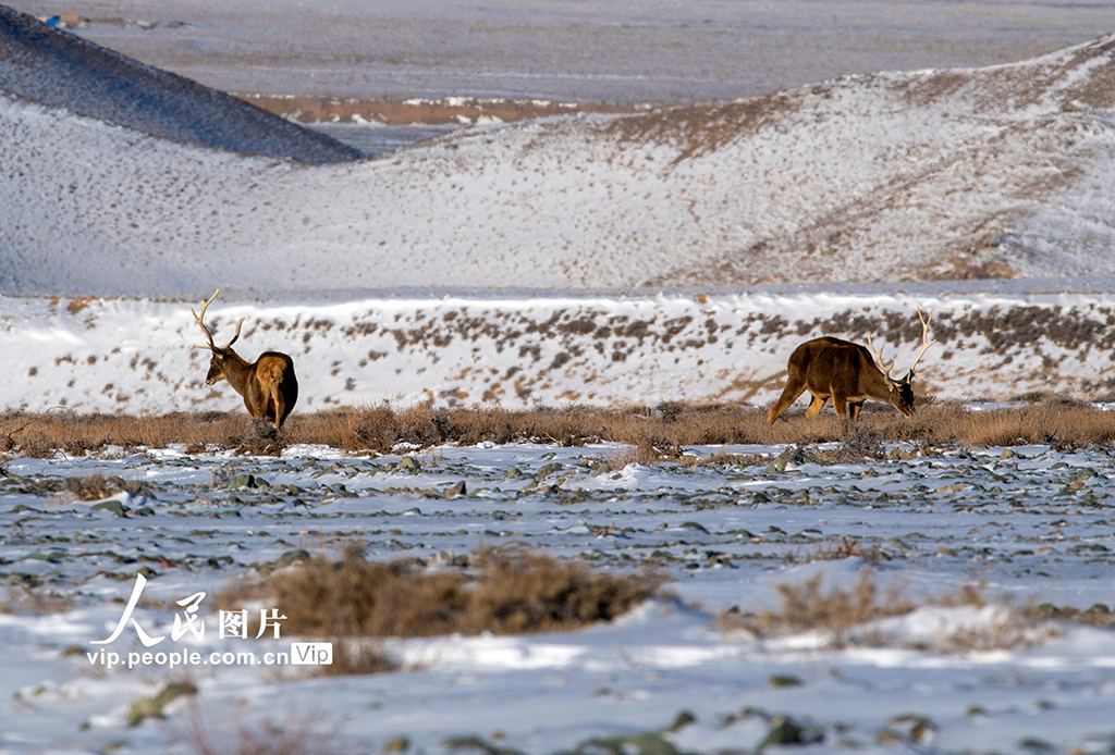 Photo shows wildlife as they roam freely on the snow-covered Haerteng plateau in Kazak Autonomous County of Aksay, northwest China's Gansu Province. (Photo/Gao Hongshan)