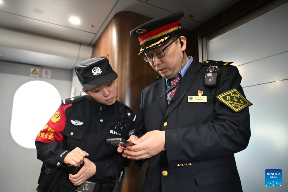Feng Wenyu (L) talks with train conductor Wang Dong about passenger numbers aboard the bullet train coded G113 on Jan. 24, 2025. (Xinhua/Sun Fanyue)