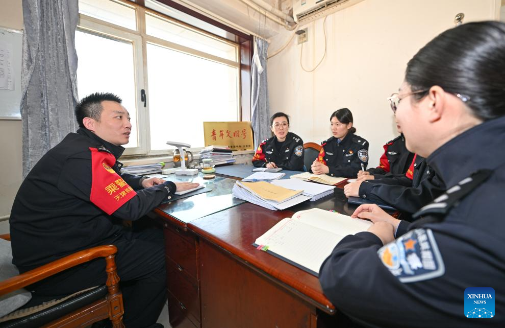 Feng Wenyu (3rd L) attends a meeting at the Tianjin railway police detachment of Beijing Railway Public Security Bureau in Tianjin, north China, Jan. 22, 2025. (Xinhua/Sun Fanyue)