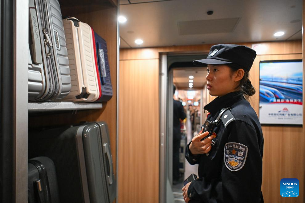 Feng Wenyu patrols a carriage aboard the bullet train coded G8914 on Jan. 24, 2025. (Xinhua/Sun Fanyue)