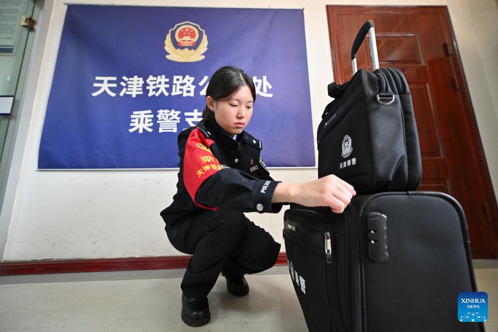 Feng Wenyu checks police equipment at the Tianjin railway police detachment of Beijing Railway Public Security Bureau in Tianjin, north China, Jan. 22, 2025. (Xinhua/Sun Fanyue)