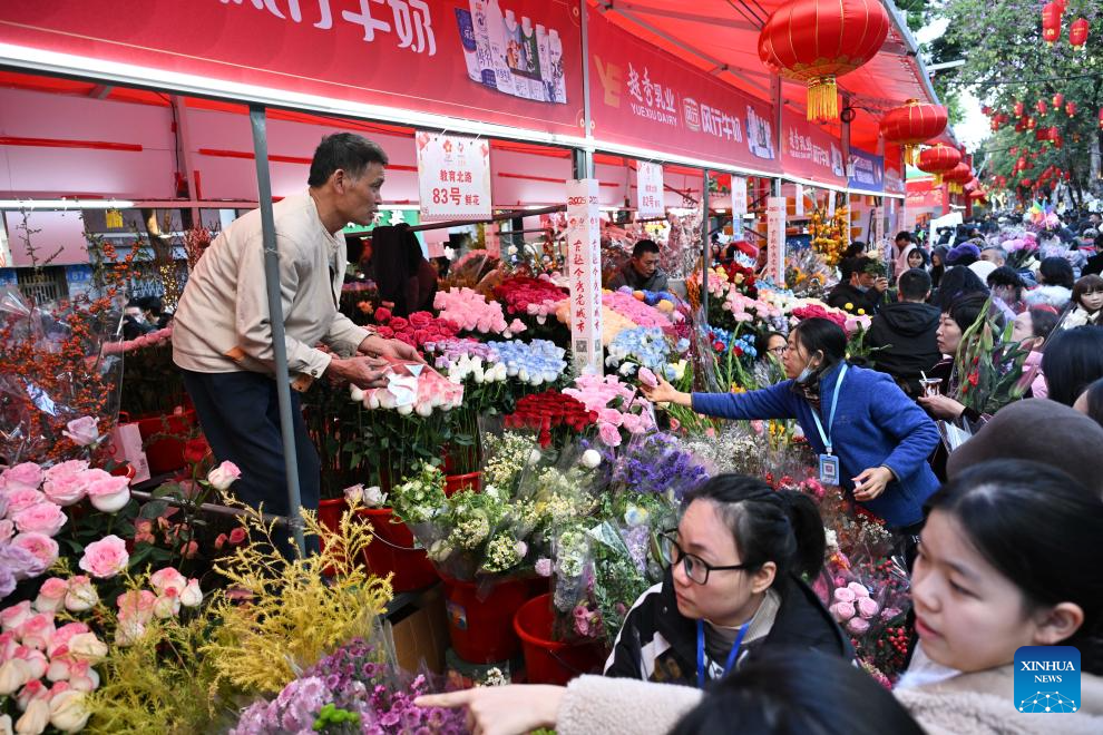 Residents shop at a flower market in Yuexiu District, Guangzhou, south China's Guangdong Province, Jan. 27, 2025. China is alive with vibrant celebrations with the Spring Festival just around the corner. (Xinhua/Deng Hua)