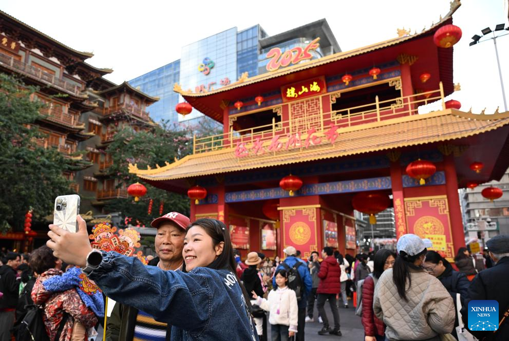 Tourists pose for a selfie at a flower market in Yuexiu District, Guangzhou, south China's Guangdong Province, Jan. 27, 2025. China is alive with vibrant celebrations with the Spring Festival just around the corner. (Xinhua/Deng Hua)