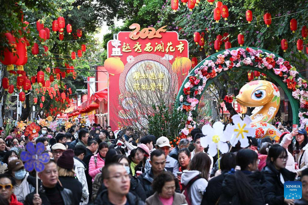 People visit a flower market in Yuexiu District, Guangzhou, south China's Guangdong Province, Jan. 27, 2025. China is alive with vibrant celebrations with the Spring Festival just around the corner. (Xinhua/Deng Hua)