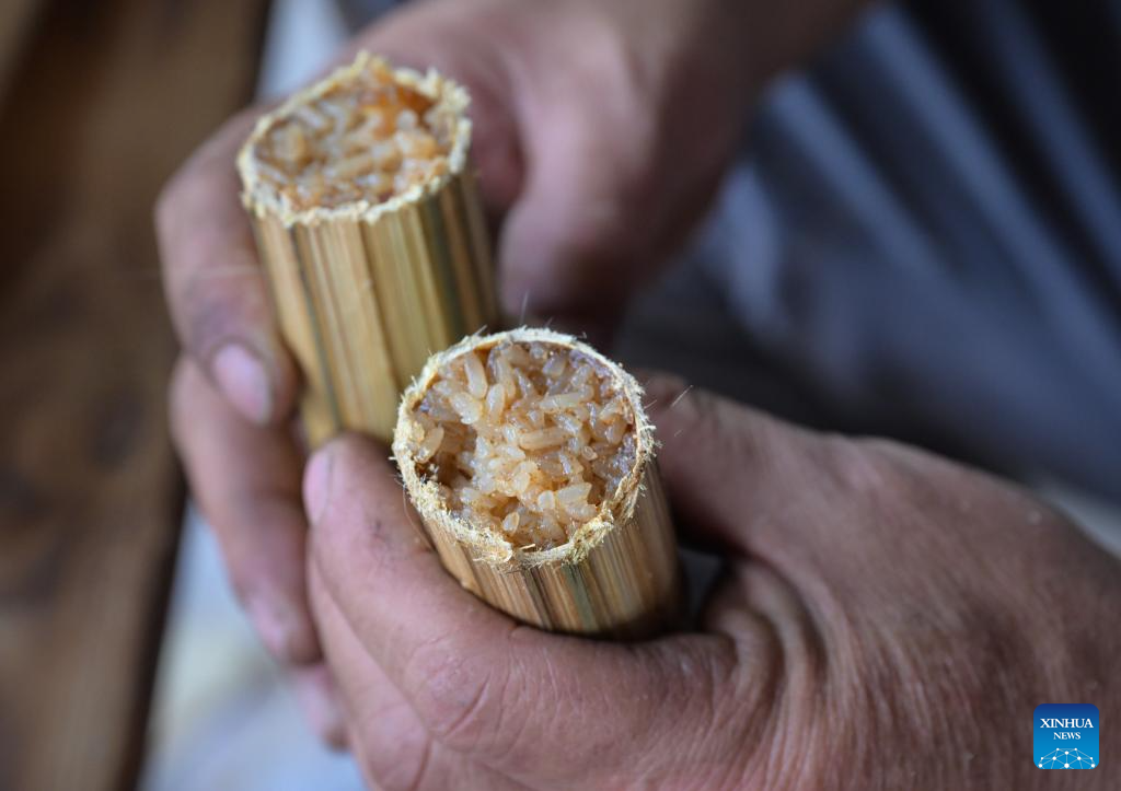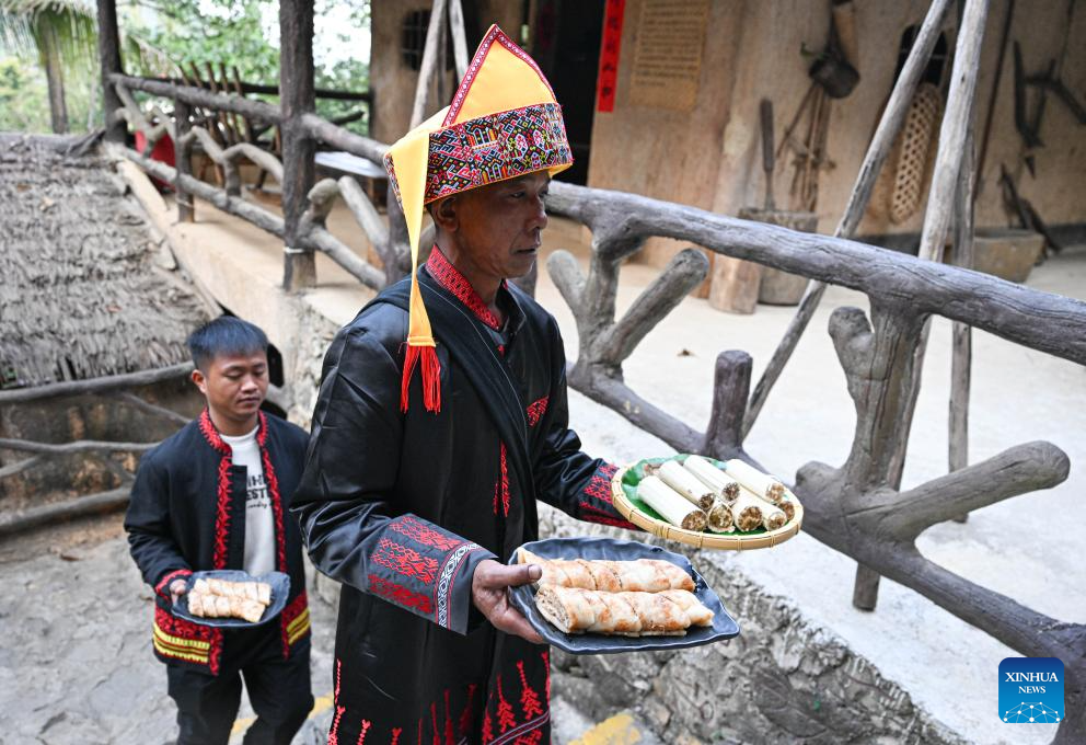 A villager shows sticky rice food in bamboo tubes at Binglanggu tourism area in Baoting Li and Miao Autonomous County, south China's Hainan Province, Jan. 28, 2025. An event featuring Li ethnic group culture was held at Binglanggu tourism area to celebrate the Chinese New Year, where tourists could dress in traditional Li attire and taste food with Li characteristics. (Xinhua/Pu Xiaoxu)