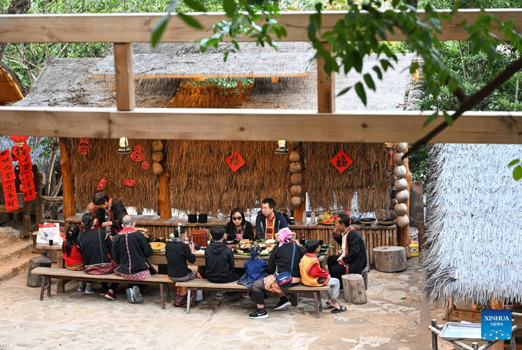 Tourists enjoy a traditional family reunion dinner of Li ethnic group at Binglanggu tourism area in Baoting Li and Miao Autonomous County, south China's Hainan Province, Jan. 28, 2025. An event featuring Li ethnic group culture was held at Binglanggu tourism area to celebrate the Chinese New Year, where tourists could dress in traditional Li attire and taste food with Li characteristics. (Xinhua/Pu Xiaoxu)