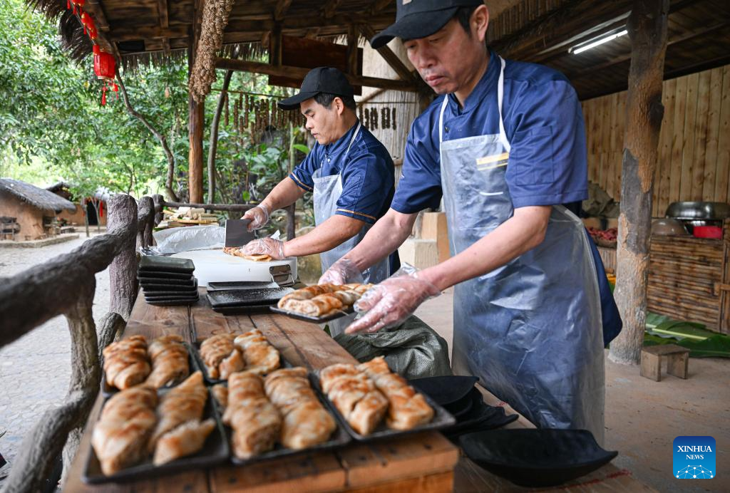 Villagers prepare rolls made from sticky rice and coconuts at Binglanggu tourism area in Baoting Li and Miao Autonomous County, south China's Hainan Province, Jan. 28, 2025. An event featuring Li ethnic group culture was held at Binglanggu tourism area to celebrate the Chinese New Year, where tourists could dress in traditional Li attire and taste food with Li characteristics. (Xinhua/Pu Xiaoxu)