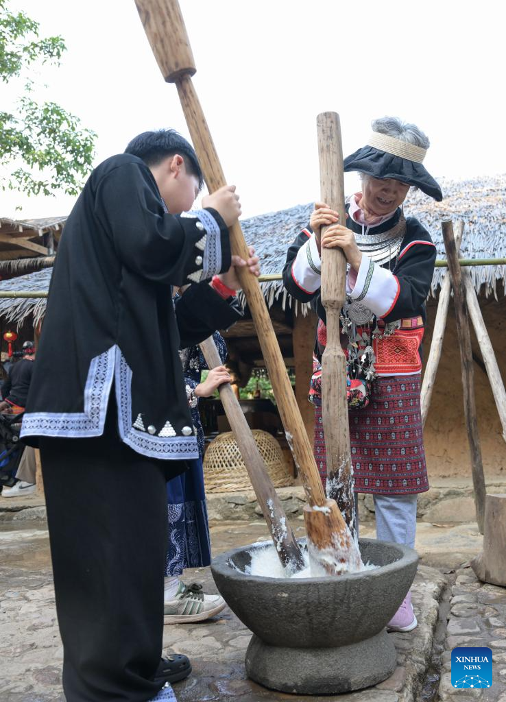Tourists wearing attire of Li ethnic group learn to make rice cakes at Binglanggu tourism area in Baoting Li and Miao Autonomous County, south China's Hainan Province, Jan. 28, 2025. An event featuring Li ethnic group culture was held at Binglanggu tourism area to celebrate the Chinese New Year, where tourists could dress in traditional Li attire and taste food with Li characteristics. (Xinhua/Pu Xiaoxu)