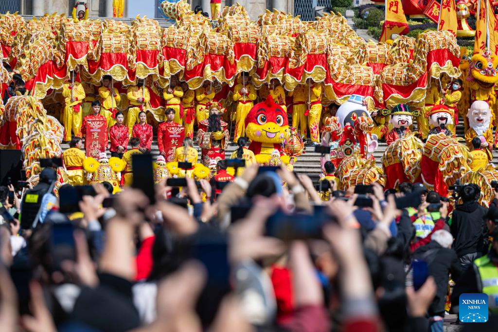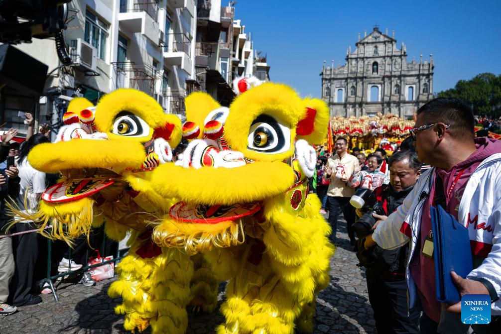 People perform lion dance during a tour event in celebration of the Chinese New Year in front of the Ruins of St. Paul's in Macao, south China, Jan. 29, 2025. (Xinhua/Cheong Kam Ka)