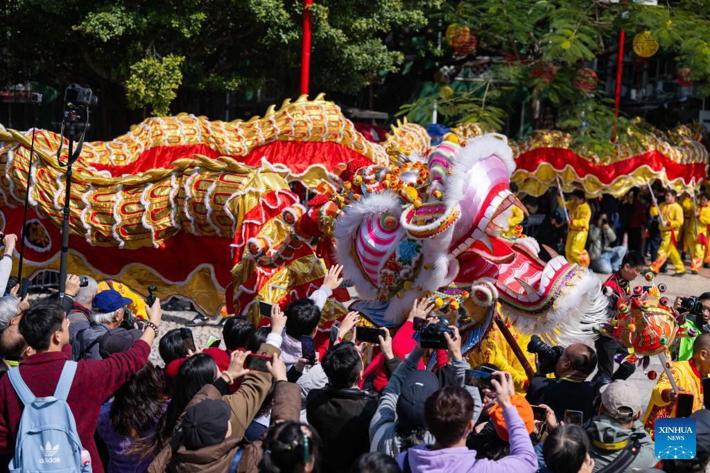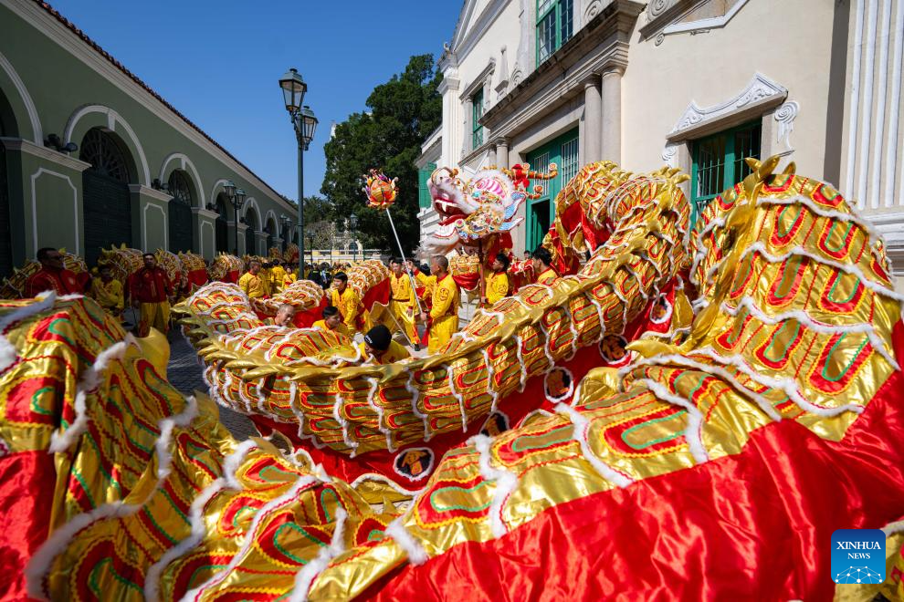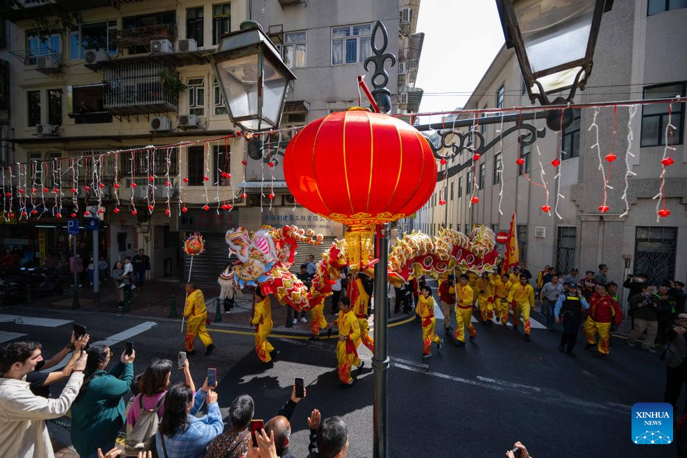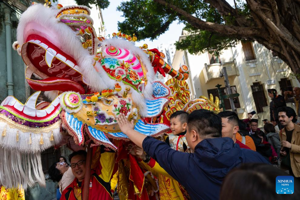 The dragon dance performing team interact with citizens during a tour event in celebration of the Chinese New Year at the St. Lawrence Parish in Macao, south China, Jan. 29, 2025. (Xinhua/Cheong Kam Ka)