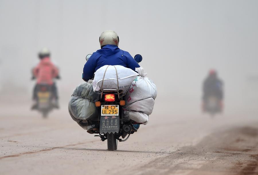 Photo taken on Feb. 5, 2015 shows a man returning home by motorcycle on the Wuzhou section of 321 national highway in south China's Guangxi Zhuang Autonomous Region. (Xinhua/Huang Xiaobang)