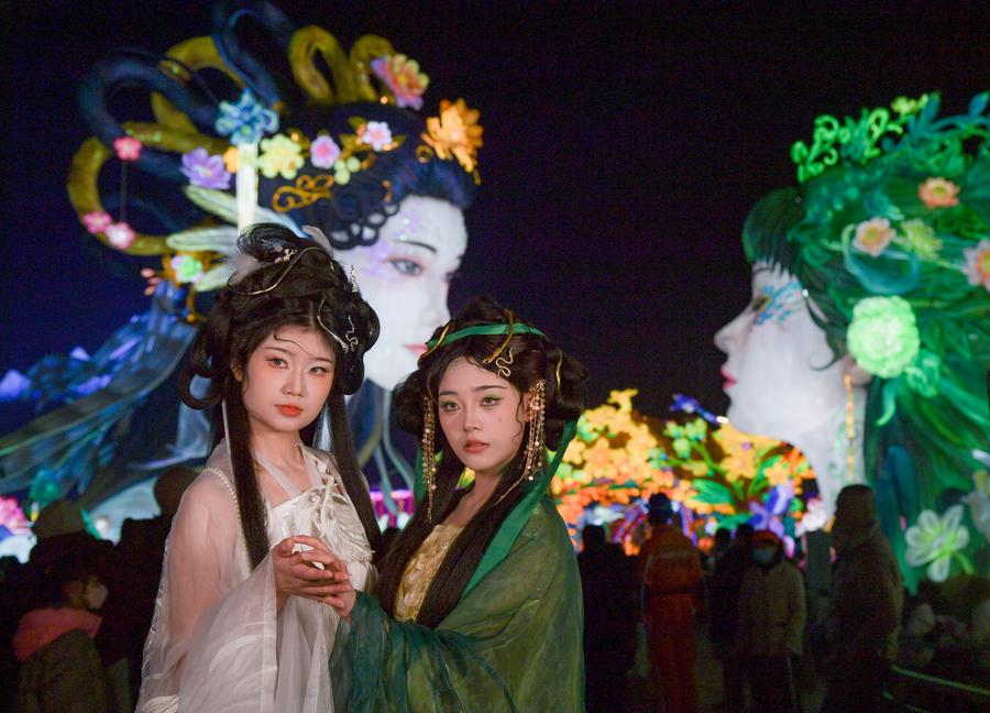 Tourists pose for photos at the 31st Zigong International Dinosaur Lantern Show in Zigong, southwest China's Sichuan Province, Jan. 17, 2025. (Xinhua/Wang Xi)