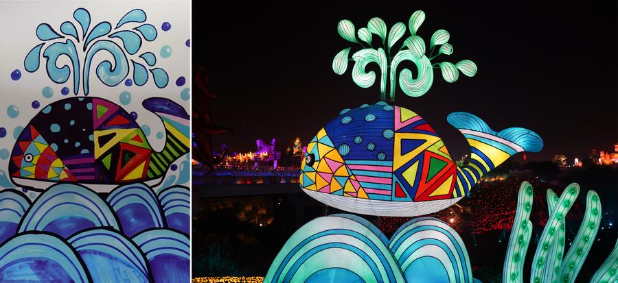 This combo photo shows a child's drawing (L) and light installations of the drawing at the 31st Zigong International Dinosaur Lantern Show during trial operation in Zigong, southwest China's Sichuan Province, Jan. 14, 2025. (Xinhua/Xu Bingjie)
