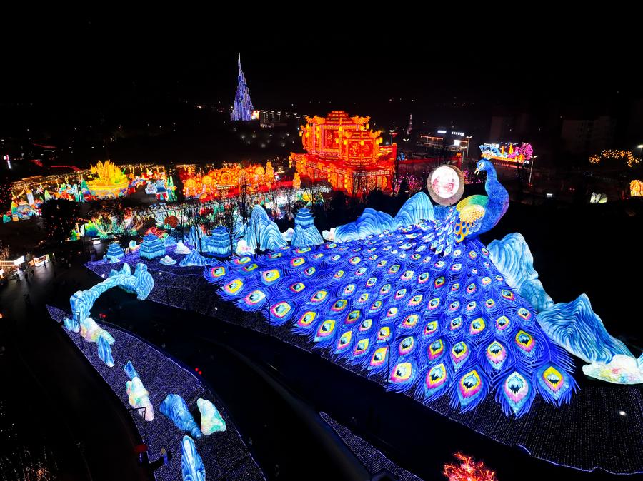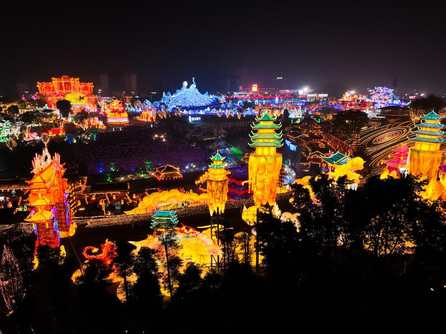 A drone photo shows light installations at the 31st Zigong International Dinosaur Lantern Show in Zigong, southwest China's Sichuan Province, Jan. 17, 2025. (Xinhua/Wang Xi)