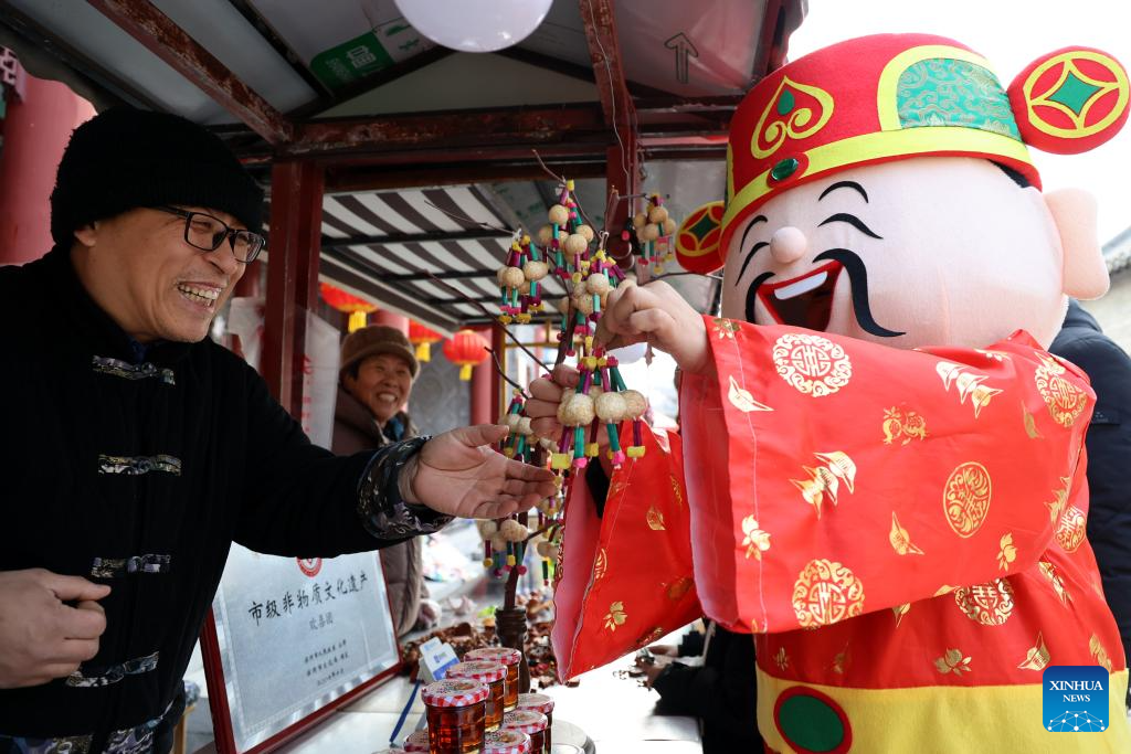 A staff member dressed as a "God of Wealth" offers blessings to a stall operator at a scenic area in Wudi County, Binzhou City, east China's Shandong Province, Feb. 2, 2025. Folk events were held across the country on Sunday to receive the "Gods of Wealth," a tradition to celebrate the fifth day of the Chinese New Year, or the Spring Festival. (Photo by Chu Baorui/Xinhua)