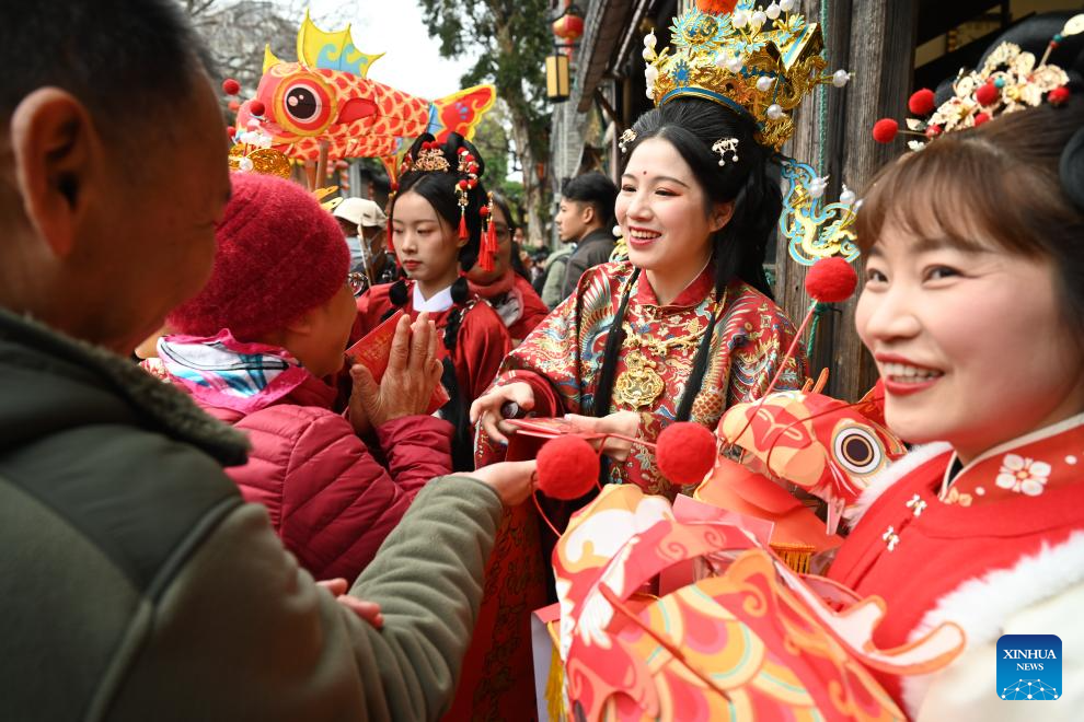 A woman dressed as a "Goddess of Wealth" (1st L) offers blessings to tourists in front of shops in Sanfangqixiang (Three Lanes and Seven Alleys) area in Fuzhou, southeast China's Fujian Province, Feb. 2, 2025. Folk events were held across the country on Sunday to receive the "Gods of Wealth," a tradition to celebrate the fifth day of the Chinese New Year, or the Spring Festival. (Xinhua/Lin Shanchuan)