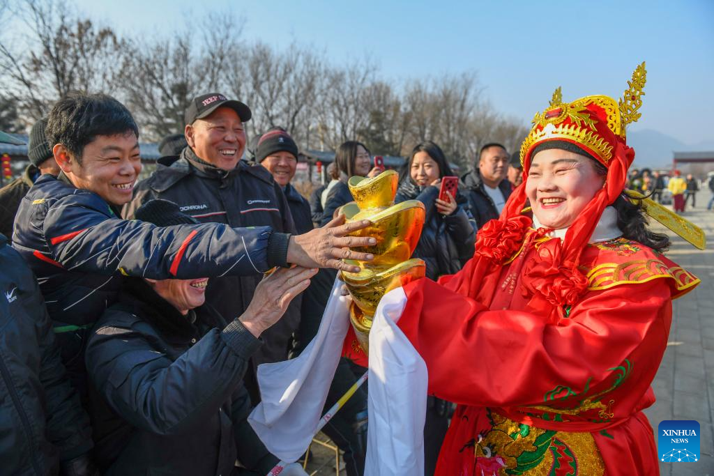 A staff member dressed as a "God of Wealth" interacts with tourists at a scenic spot in Zunhua City, north China's Hebei Province, Feb. 2, 2025. Folk events were held across the country on Sunday to receive the "Gods of Wealth," a tradition to celebrate the fifth day of the Chinese New Year, or the Spring Festival. (Photo by Liu Mancang/Xinhua)