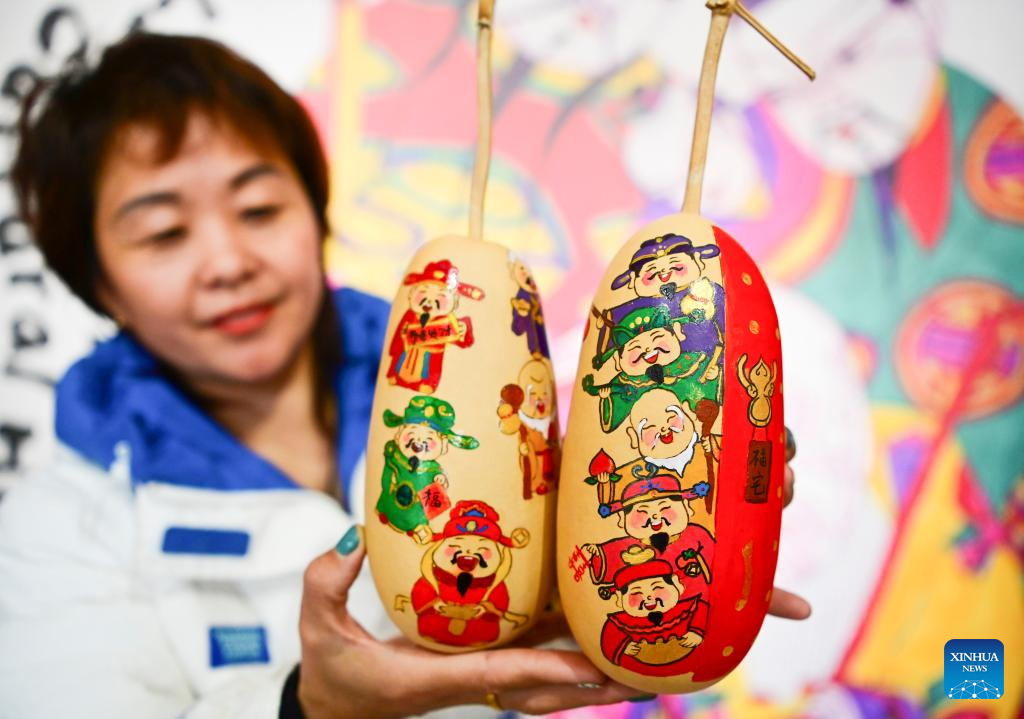 A tourist displays crafted gourds bearing the images of "Gods of Wealth" at a scenic area in Liaocheng City, east China's Shandong Province, Feb. 2, 2025. Folk events were held across the country on Sunday to receive the "Gods of Wealth," a tradition to celebrate the fifth day of the Chinese New Year, or the Spring Festival. (Photo by Zhang Zhenxiang/Xinhua)