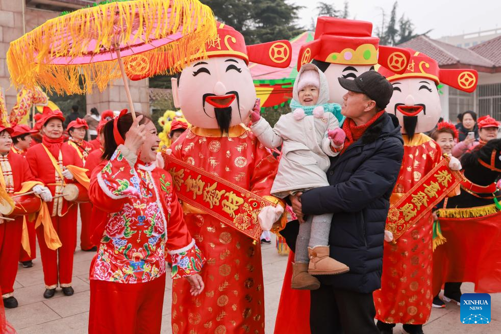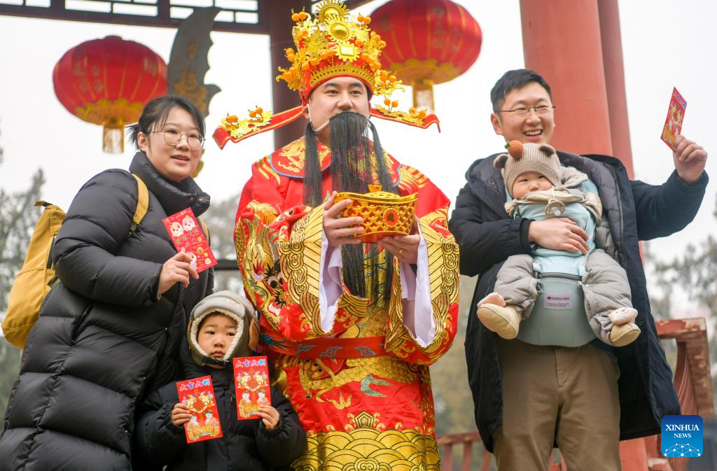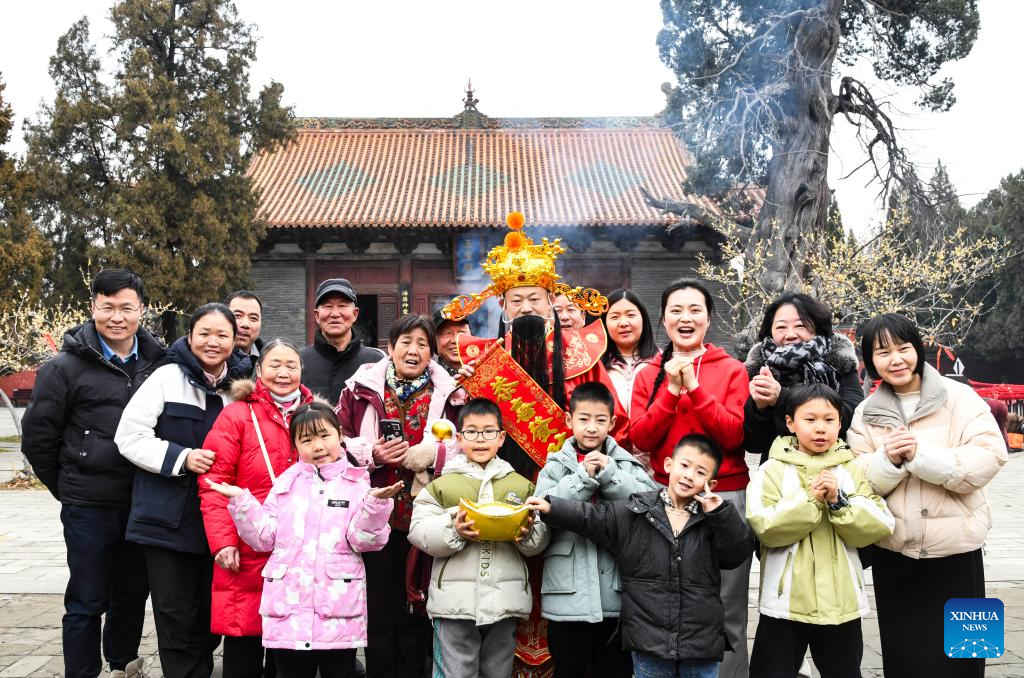 Tourists pose for photos with a staff member dressed as a "God of Wealth" at Guanlin scenic area in Luoyang City, central China's Henan Province, Feb. 2, 2025. Folk events were held across the country on Sunday to receive the "Gods of Wealth," a tradition to celebrate the fifth day of the Chinese New Year, or the Spring Festival. (Photo by Zhang Yixi/Xinhua)