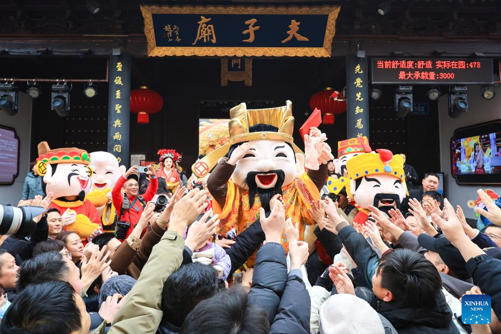 A staff member dressed as a "God of Wealth" interacts with tourists at Confucius Temple scenic area in Nanjing, east China's Jiangsu Province, Feb. 2, 2025. Folk events were held across the country on Sunday to receive the "Gods of Wealth," a tradition to celebrate the fifth day of the Chinese New Year, or the Spring Festival. (Photo by Su Yang/Xinhua)