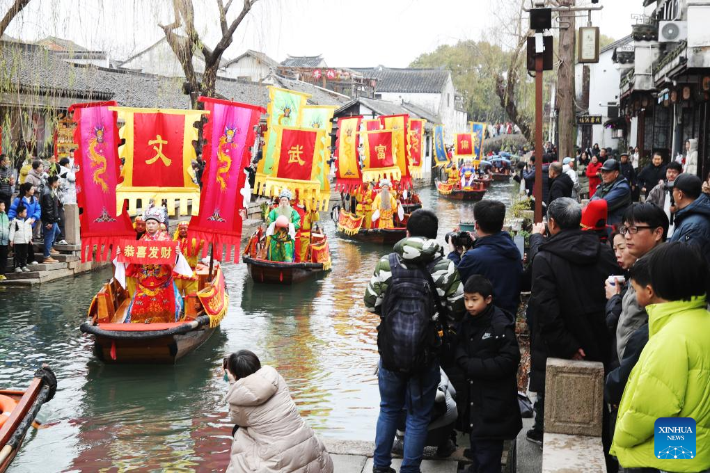 Staff members dressed as the "Gods of Wealth" offer blessings to shop onwers and tourists during a boat parade at the ancient town of Zhouzhuang, Suzhou City, east China's Jiangsu Province, on Feb. 2, 2025. Folk events were held across the country on Sunday to receive the "Gods of Wealth," a tradition to celebrate the fifth day of the Chinese New Year, or the Spring Festival. (Photo by Zhu Guigen/Xinhua)
