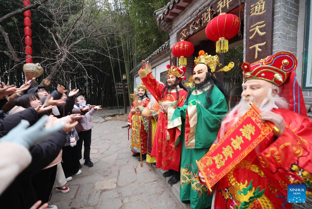 Staff members dressed as the "Gods of Wealth" offer blessings to tourists at a temple for the gods of wealth in Yi'nan County, Linyi City, east China's Shandong Province, Feb. 2, 2025. Folk events were held across the country on Sunday to receive the "Gods of Wealth," a tradition to celebrate the fifth day of the Chinese New Year, or the Spring Festival. (Photo by Wang Yanbing/Xinhua)
