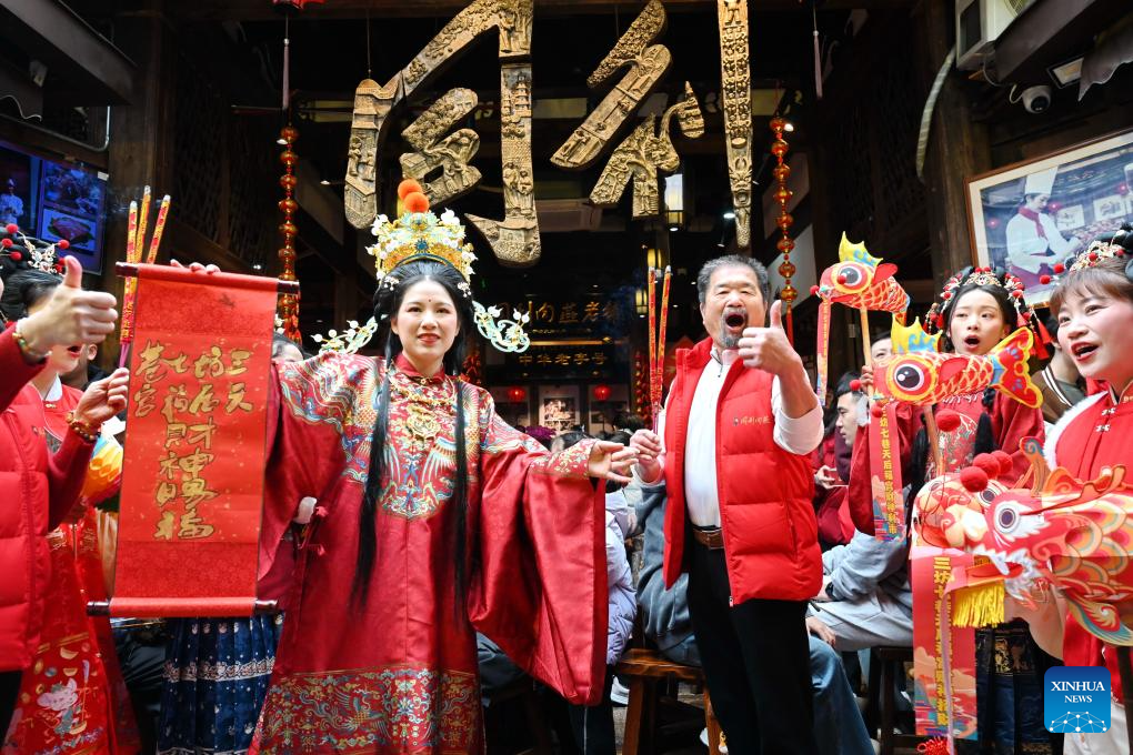 A woman dressed as a "Goddess of Wealth" (C) offers New Year blessings to tourists in front of shops in Sanfangqixiang (Three Lanes and Seven Alleys) area in Fuzhou, southeast China's Fujian Province, Feb. 2, 2025. Folk events were held across the country on Sunday to receive the "Gods of Wealth," a tradition to celebrate the fifth day of the Chinese New Year, or the Spring Festival. (Xinhua/Lin Shanchuan)